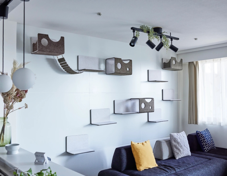 壁に専用パネルを施工して、磁石でくっつくキャットウオークをレイアウトする商品です。